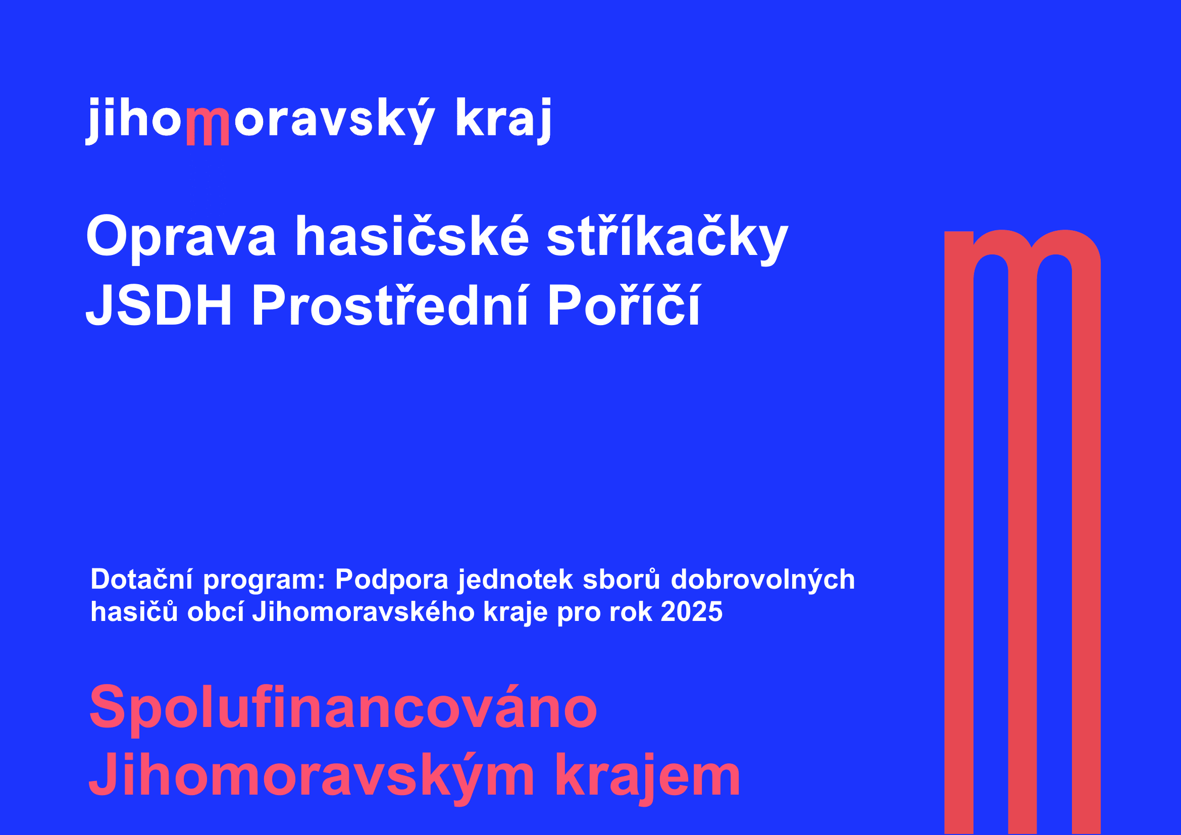 V rámci projektu „Oprava hasičské stříkačky JSDH Prostřední Poříčí“ byla realizována oprava hasičské stříkačky za 58 767,- Kč. Jihomoravský kraj se v rámci dotačního programu Podpora jednotek sborů dobrovolných hasičů obcí Jihomoravského kraje pro rok 2024 podílel na tomto projektu částkou 41 136,90,- Kč