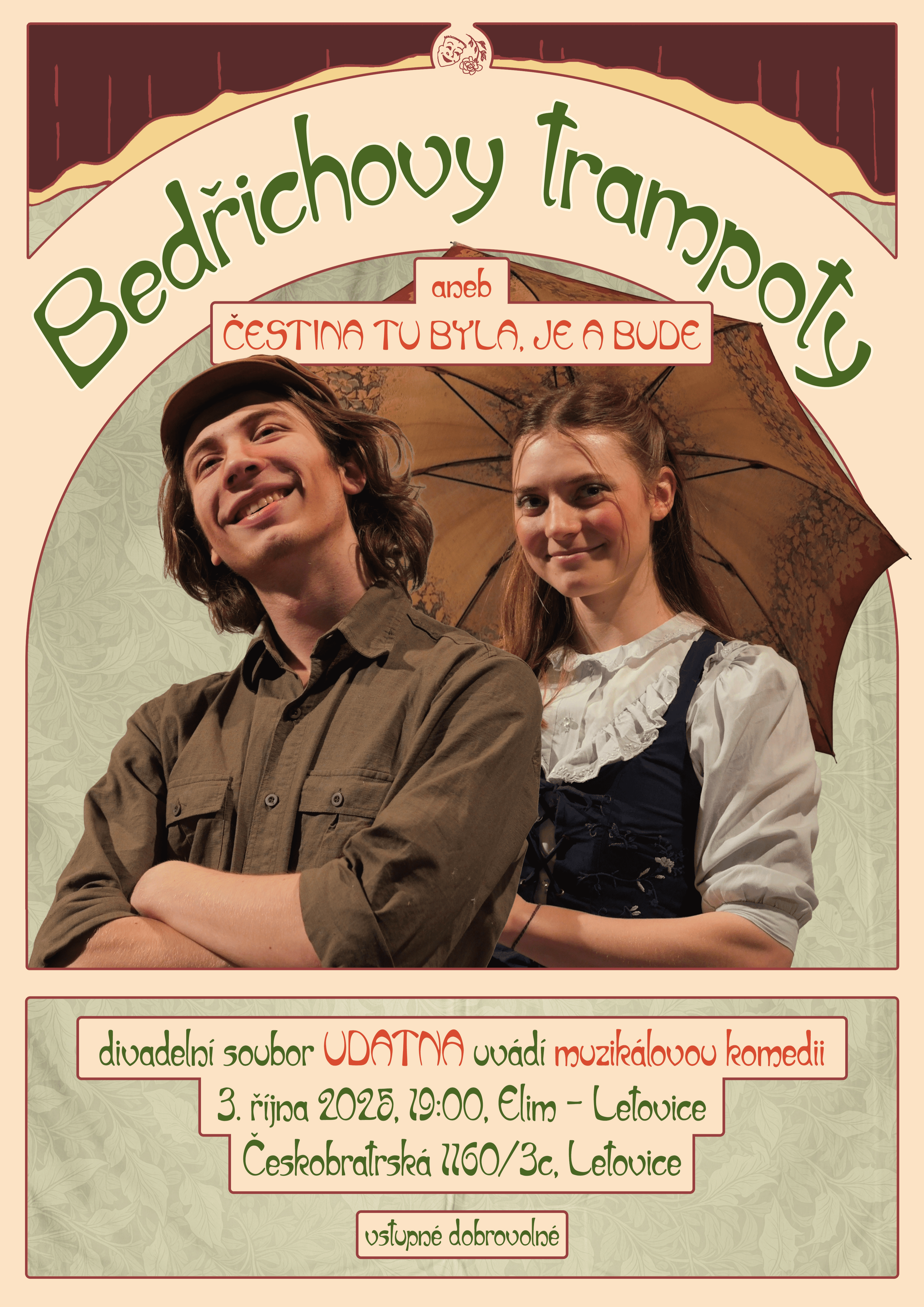 Divadelní spolek Udatna zve na divadelní představení Bedřichovy trampoty aneb čeština tu byla, je a bude.